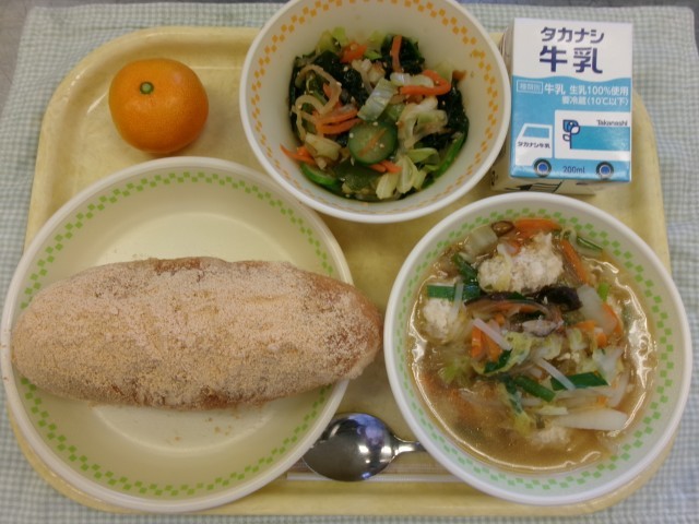 今日のおはなし給食は、「パンやのろくちゃんでんしゃにのって」より「みかん」です。おばあちゃんにお届け物をするため、おじいちゃんと一緒に電車にのったろくちゃん。おばあちゃんちに行くまでの楽しい旅のお話です。さて、みかんはどの場面に出てくるでしょうか。パンやのろくちゃんシリーズの本は、1冊読むと全シリーズ読みたくなる魅力ある本です。図書館に全シリーズありますので、探してみてくださいと、お知らせしました。