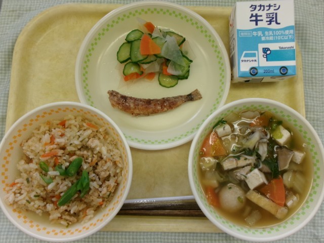 今日のおはなし給食は、「もしも日本人がみんな米つぶだったら」より「ご飯」です。お米は毎日食べる身近な食べ物です。さて、みなさんはお茶碗1杯にどのくらいの米粒が入ってるか考えたことはありますか?この本はお茶碗1杯がどのくらいの米粒なのか、都市の規模と人口、お米の消費量など、普段何気なく食べているお米からいろいろなことが学べる本です。ぜひ読んでみてください。ご飯は一粒一粒大切に食べてくださいと、お話ししました。