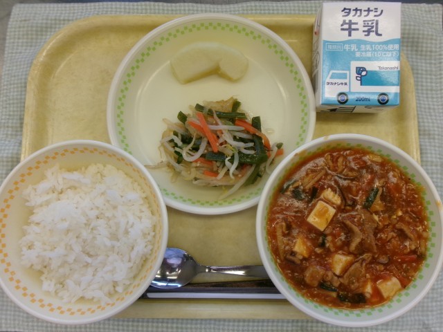 今日の家常豆腐は、中国四川省の家庭料理のひとつです。家常とは家庭風とか家にありふれたという意味があり、家にある食材と豆腐を使った料理のことをいいます。中国では、豆腐や生揚げを使って作ることが多いようです。給食では煮崩れしにくい生揚げを使ってみそ味で作りました。
