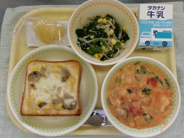 今日は、給食の人気メニューのひとつ「カレー」です。カレーは、日本では明治時代から食べられていました。日本のカレーは、インドのカレーがインドからイギリスに伝わり、イギリスでイギリス風にアレンジされたものが日本に伝わり、さらに日本で日本風にアレンジされて今のカレーになったようです。今日の給食は、えびといかを入れたシーフードカレーにしました。