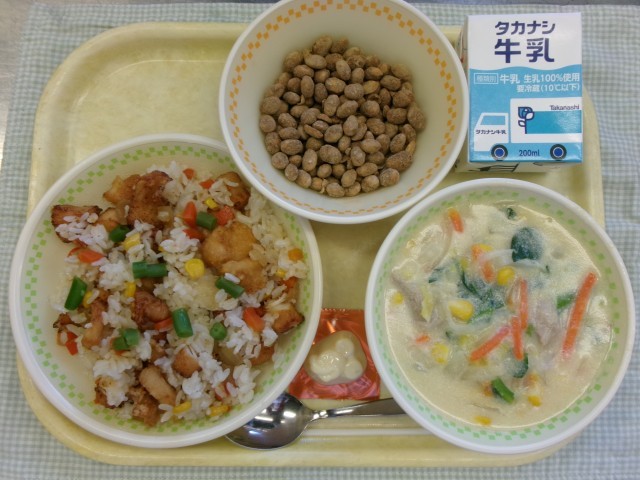 今月の給食目標は「食後は静かに休もう」です。食事をしたあとすぐに走り回ったりすると、食べたものの消化がうまく出来ず、お腹が痛くなることがあります。食後は静かに休んで食べたものの消化を促しましょう。今日の給食は、小さく切った鶏肉の唐揚げをピラフに混ぜた「唐揚げピラフ」を作りました。ボリューム満点メニューです。今日の給食もしっかり食べて、食後は少し休み、その後、昼休みは元気に遊ぶのがいいですねと、おはなししました。