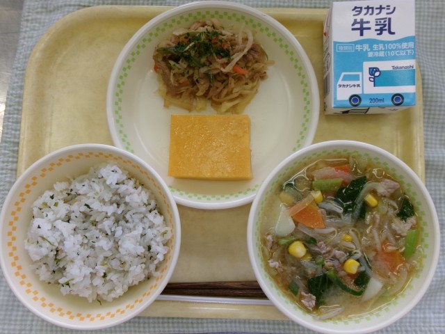 今月の給食目標は「食後は静かに休もう」です。食事をしたあとすぐに走り回ったりすると、食べたものの消化がうまく出来ず、お腹が痛くなることがあります。食後は静かに休んで食べたものの消化を促しましょう。今日の給食は、小さく切った鶏肉の唐揚げをピラフに混ぜた「唐揚げピラフ」を作りました。ボリューム満点メニューです。今日の給食もしっかり食べて、食後は少し休み、その後、昼休みは元気に遊ぶのがいいですねと、おはなししました。