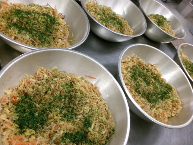 今日の給食は、節分にちなんだ献立にしました。節分とは、季節が変わる前の日のことをいいます。まだ寒いですが、2月4日は立春で暦の上では春になります。節分には、豆まきの他にも、いわしの頭をひいらぎにさして、家の入口に置くという習慣があります。給食では、揚げたいわしに甘いたれをからめた「いわしの蒲焼き」と、すりつぶした大豆を入れた「呉汁」を作りました。