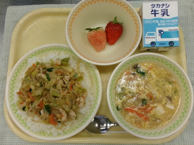 今日は、韓国料理の「タッカルビ」を作りました。韓国語で「タッ」は鶏肉、「カルビ」はあばら骨という意味があり、タッカルビは、鶏肉と野菜をコチュジャンで甘辛く炒めた料理のことです。甘辛い味付けでご飯が進みます。今日の給食では、タッカルビをご飯にかけて、タッカルビ丼としていただきました。