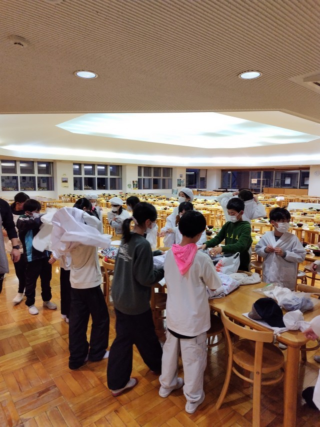 午後4時前に宿舎に到着しました。荷物を運びホールで開村式を行いました。その後、各部屋に入って荷物の整理、シーツなどの受け取りをしています。