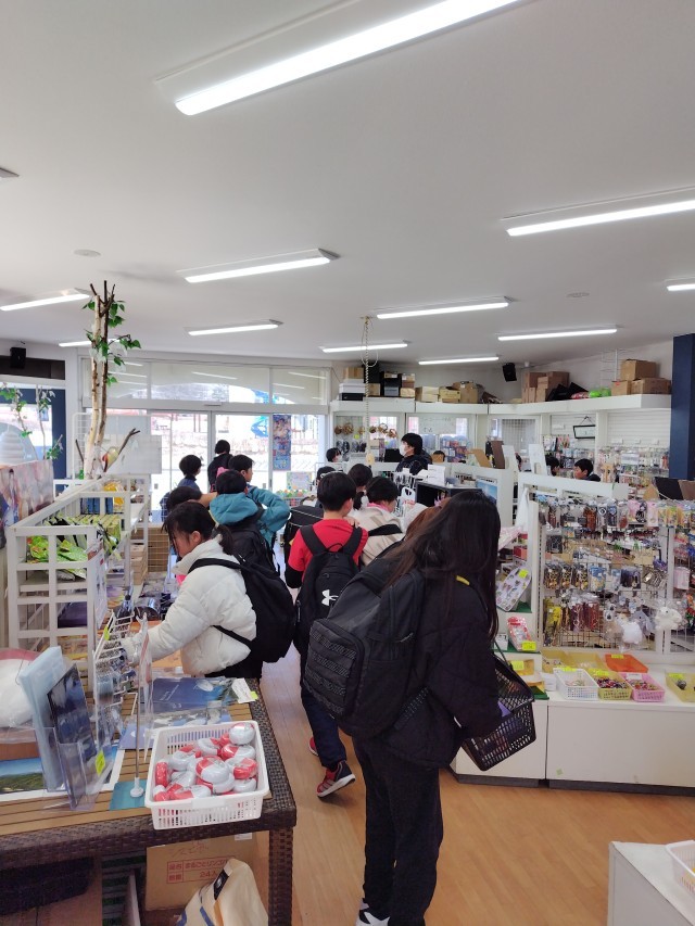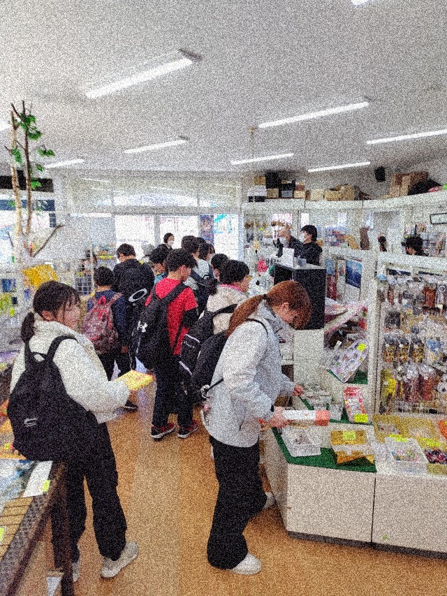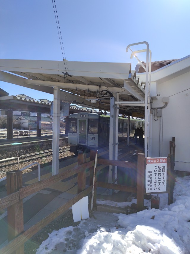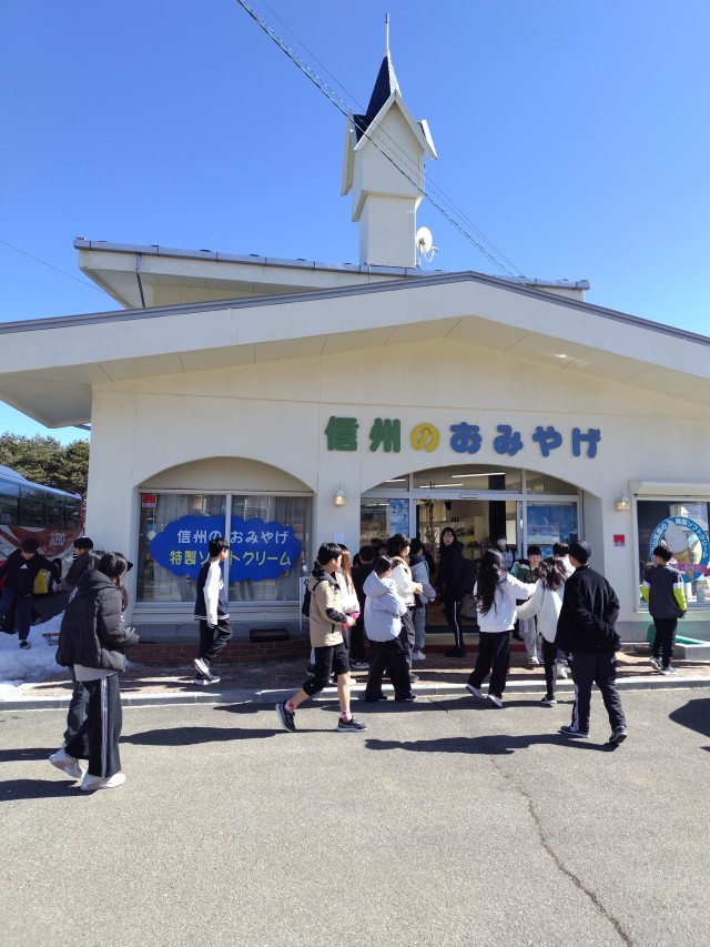 スキー場からの帰りに野辺山駅近くのお土産屋さんでお土産を買いました。渡す人のことを考えながら買っているようでした。ちょうどよく、野辺山駅に電車が停まりました。