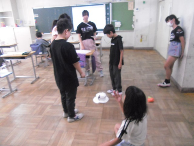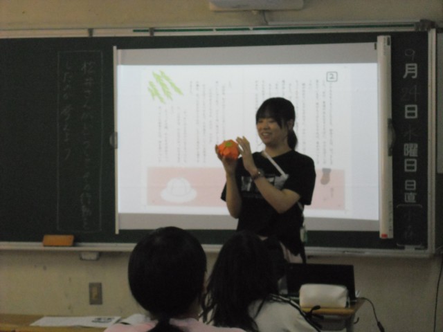 高学年の国語。あまんきみこさんの「白いぼうし」。場面ごとに登場人物の行動やその理由を考える学習でした。実際に白い帽子や夏みかん、ちょうちょも登場して、登場人物について考えていました。