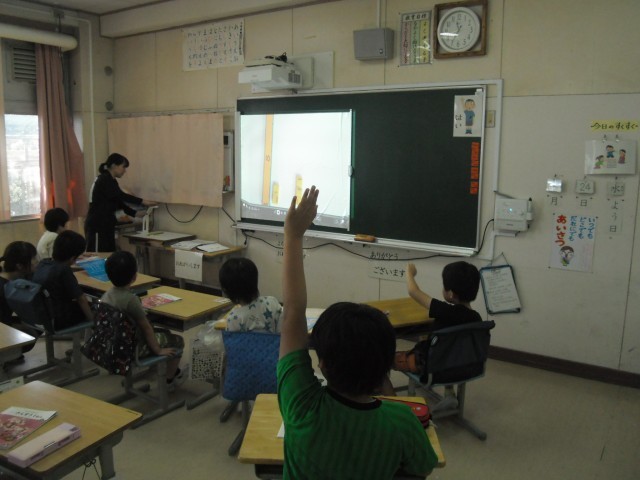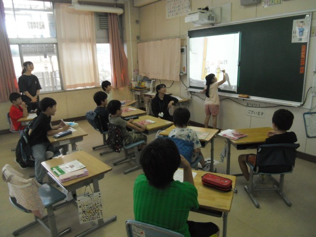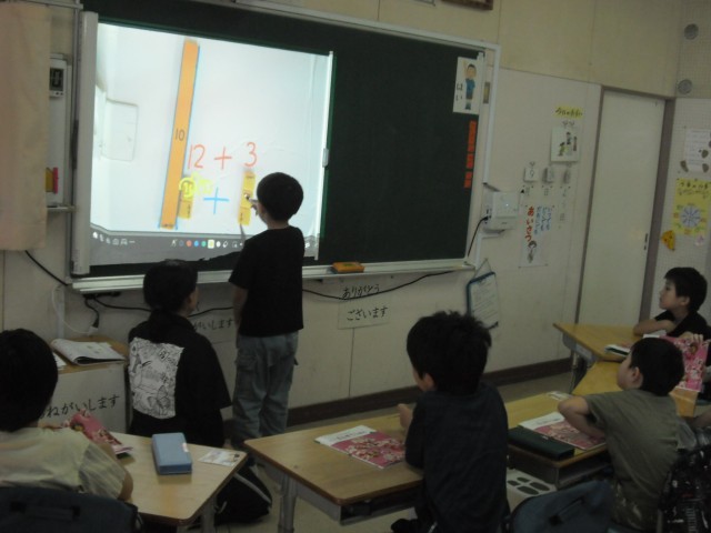 低学年は算数。ブロックを使って、みんなで考えて、自分の考えを発表していました。