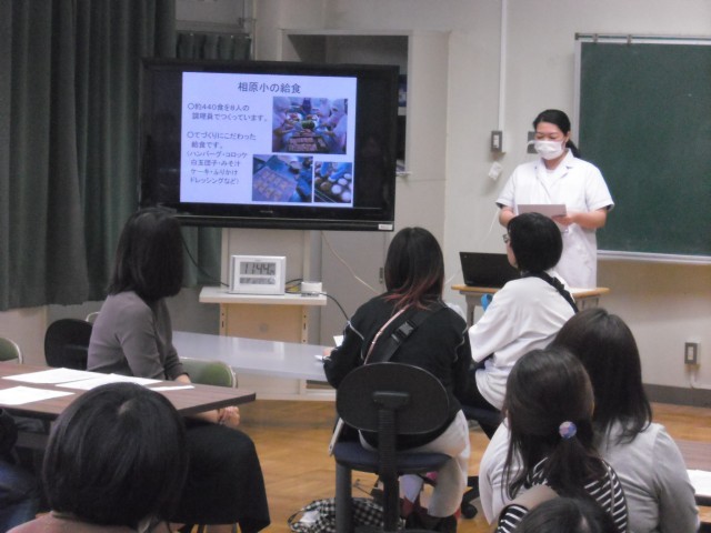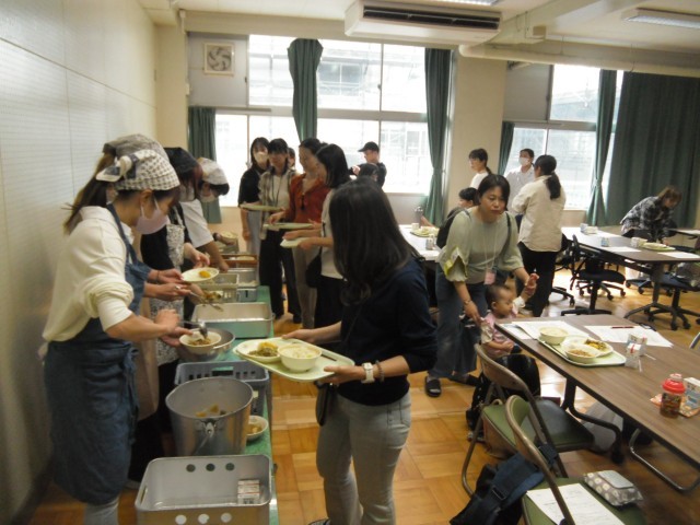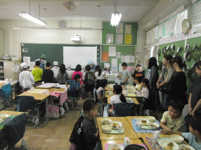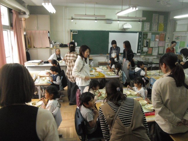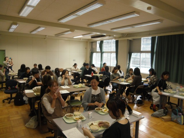 1年生の保護者の皆様が参加されました。栄養士から、学校給食についての話をしたあと、1年生の給食の配膳、食事風景を見学しました。その後、同じメニューを試食していただきました。