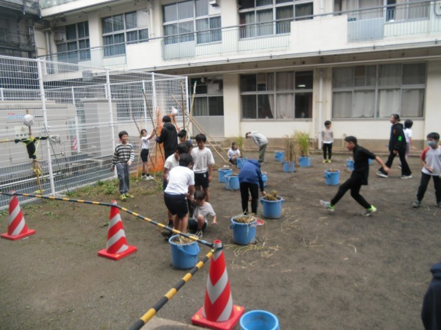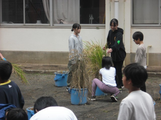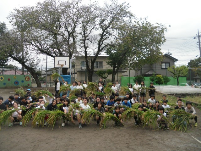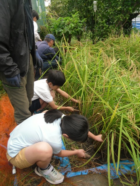 今日は、農業委員の方に鎌の使い方はじめ、稲の刈り方を教わり、安全に気を付けて行いました。ほとんどの子が、初めての体験でした。