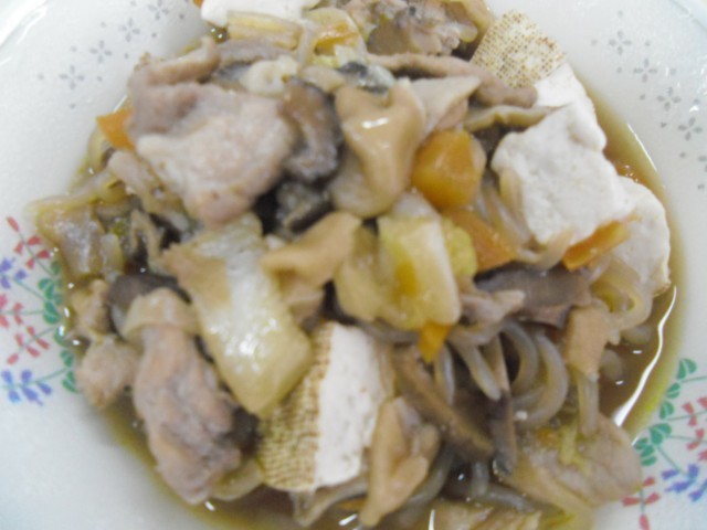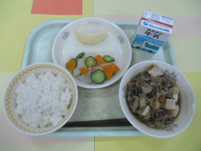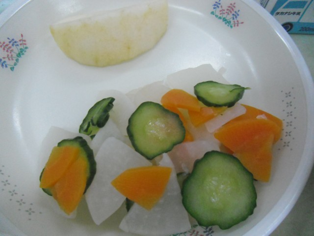 ごはん すき焼き風煮 大根の浅漬け りんご
