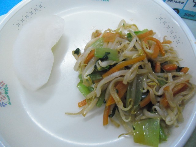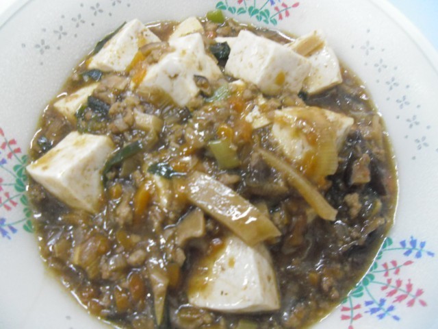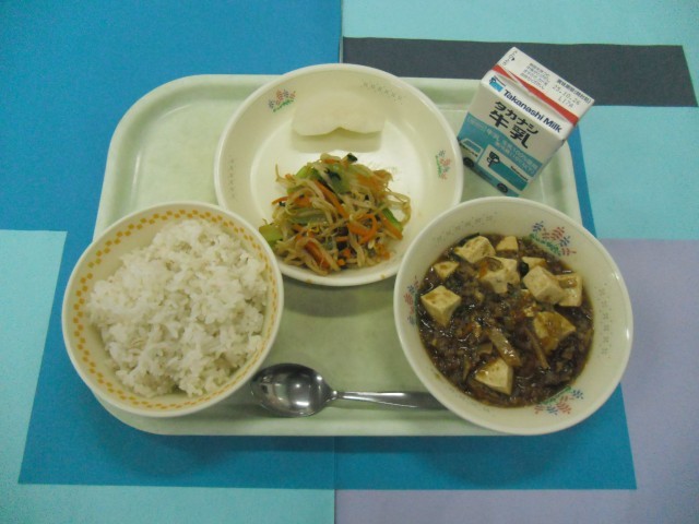 麦入りごはん とうふちゃんのマーボー豆腐 野菜のコチュジャン和え 梨