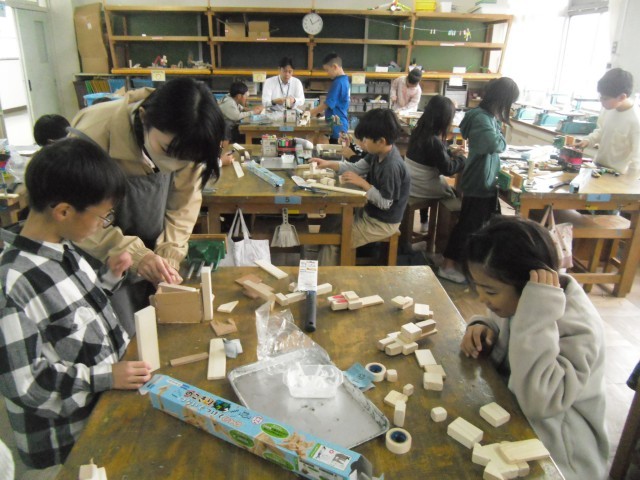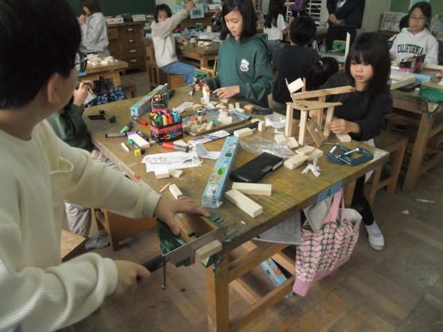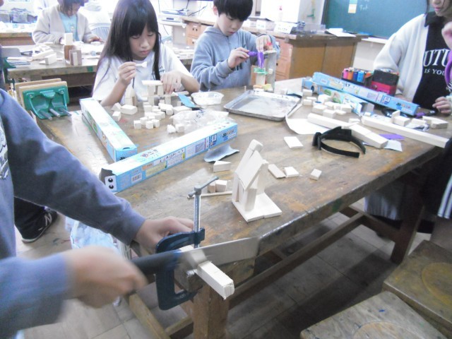 「のこぎりひいて ザクザクザク」ということで、3年生ははじめての「のこぎり」に挑戦中です。のこぎりで木を切り、木切れの組み合わせを工夫して考えて、作品を作り上げていきます。ボンドでくっつけて、色を塗ったら仕上がります。
