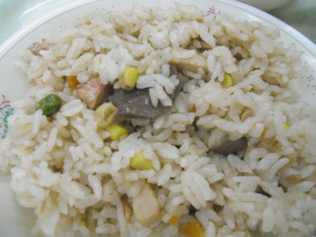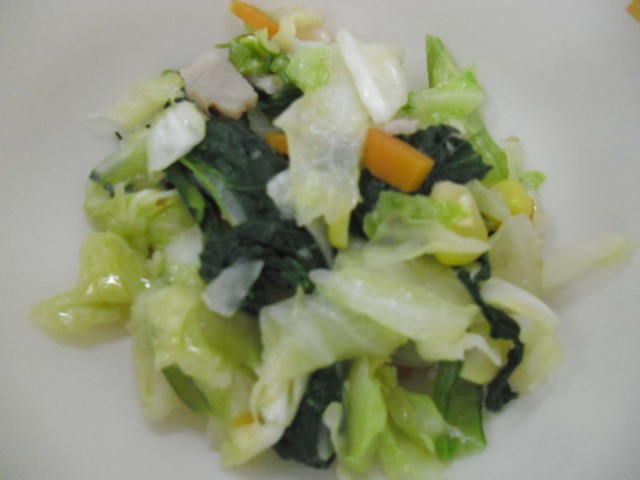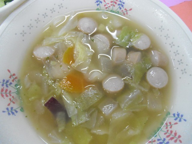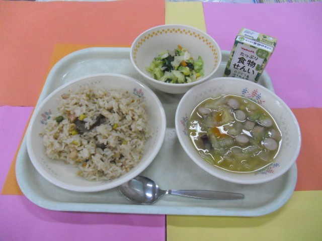サーモンピラフ ベーコンと野菜のソテー 秋野菜のスープ