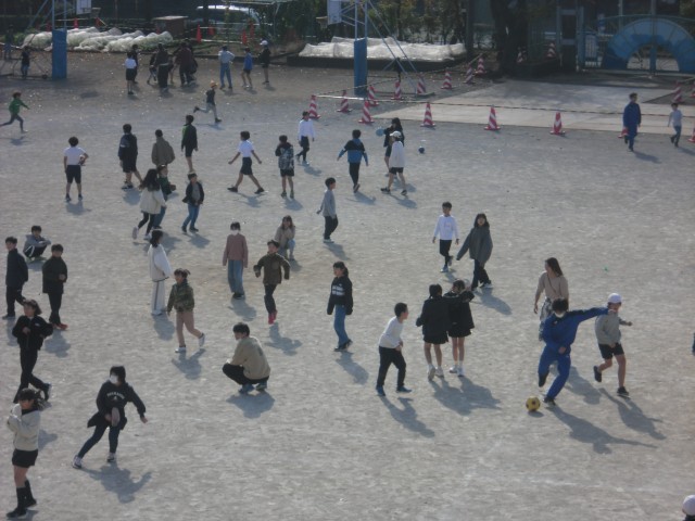 休み時間は校庭で一緒にサッカーをするなど、小学生も楽しそうでした。