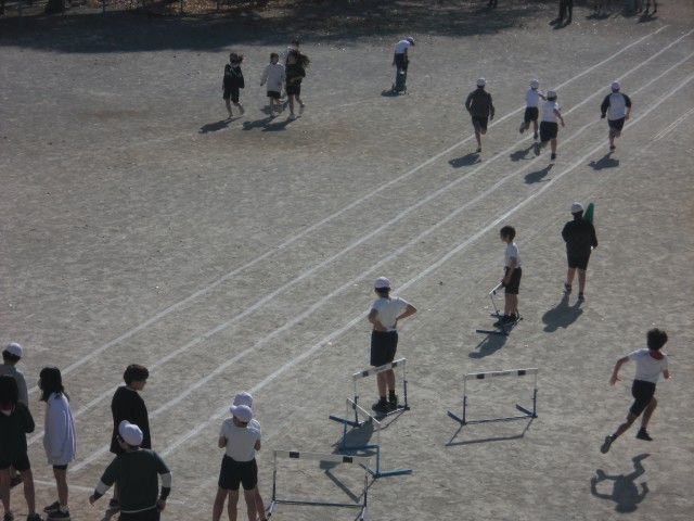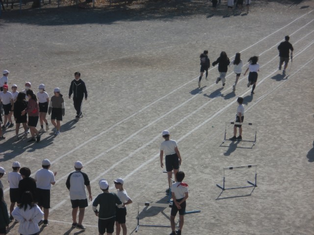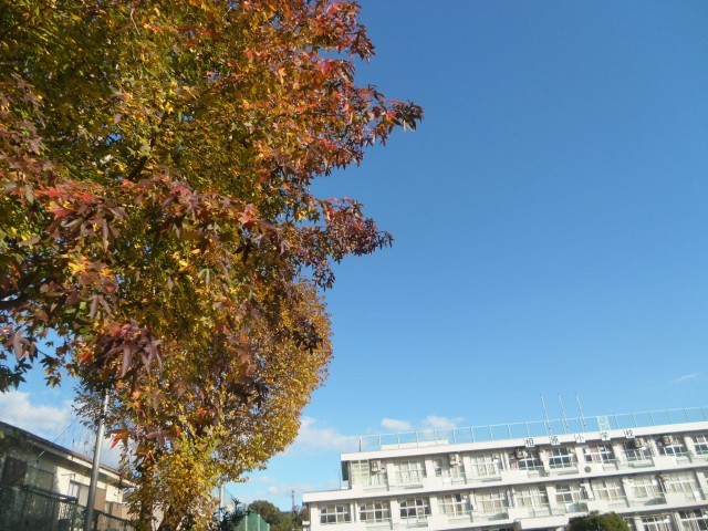 青い秋空に、緑から黄色そして赤へと色づいていく、モミジバフウの木の葉が映えています。今週、金曜日に行われる連合体育大会に向けて練習しています。