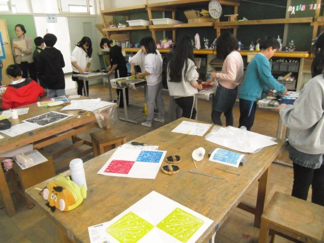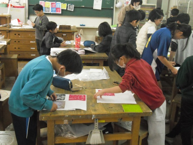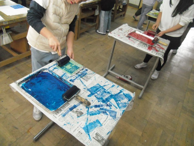 版画の学習です。小さめの板を4枚で構成する素敵な作品。色もカラフルです。版画はバレンでこすって、紙に写して、出来上がった時のうれしさがいいですね。