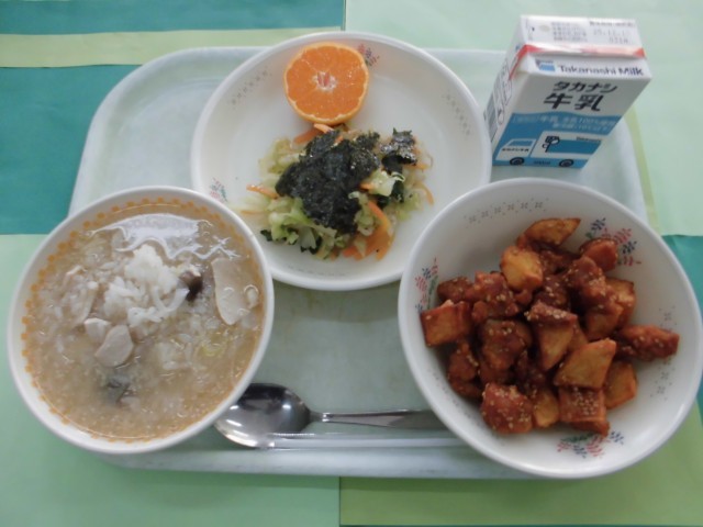 サムゲタン風雑炊 ヤンニョムチキンポテト チョレギ風サラダ みかん