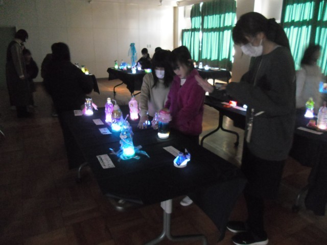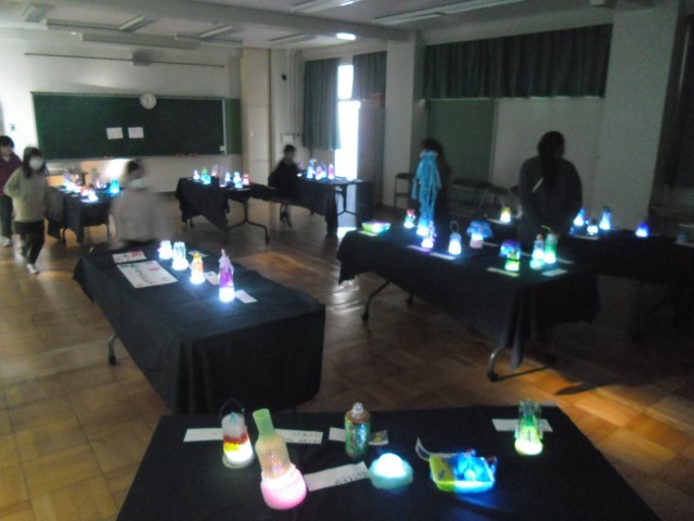 4年生の図工の作品です。暗くした多目的室で中休みに公開しました。素敵な空間に、素敵な時間が流れています。