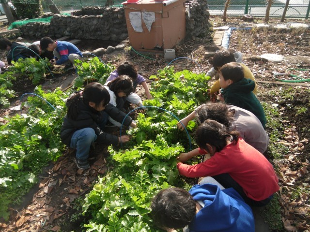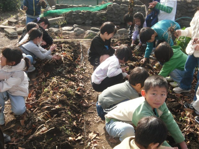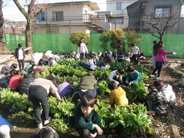 たくさん獲れました。大きいもの、小さいものとありましたが、どれもいい形でつやつやしていました。「土がついて汚れている」という声が聞こえました。畑の野菜はどれも土がついているのですが、ふだんきれいなものしか見慣れていないと、こんな感想もでてくるのですね。カブやダイコンも大きく成長中です。今日は雑草抜きをしました。学習発表会の第2章という感じで2年生、まだまだ野菜の活動、頑張っています。