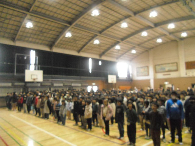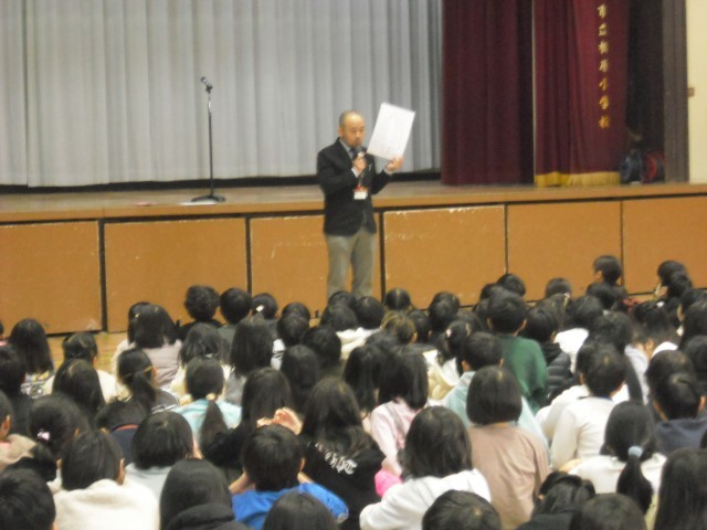 2学期最後の日、終業式です。校長からは2学期を振り返って、冬休みにやってほしいことという話がありました。続いて、児童代表の3名から、2学期頑張ったこと、そしてこれから頑張りたいことの発表がありました。とても立派な発表でした。校歌の後は、生活指導の先生から大事な話。火や水の事故に気を付けることや、お金のトラブルについて、そして交通安全の話がありました。