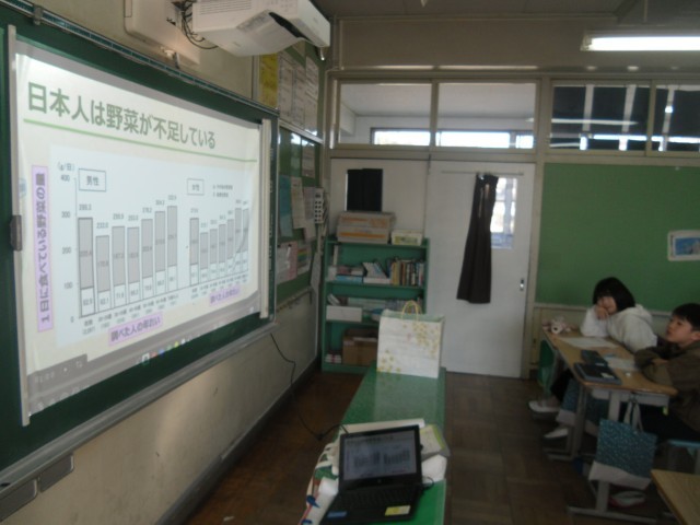 冬休みに野菜を多くとる目標をたてた4年生。成果はどうだったでしょうか。「苦手な野菜をスープにしてもらった」「野菜ジュースを毎日飲んだ」「好きな野菜をたくさん食べた」など実際に野菜を意識した生活に取り組んだことが、何よりの成果です。数字はよくなった人が多かったですが、あまり気にしなくていいです。日本人全体が野菜不足といわれています。健康の長生きするために、ぜひ、これからも野菜を意識した生活を続けてください。