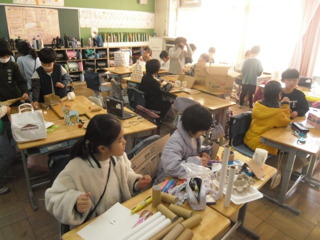 段ボールや空き箱、トイレットペーパーやラップの芯、紙コップにペットボトル、さらには、木の枝や松ぼっくり、どんぐり・・・いろいろな素材をつかって楽しく遊んでもらえるおもちゃ作りです。