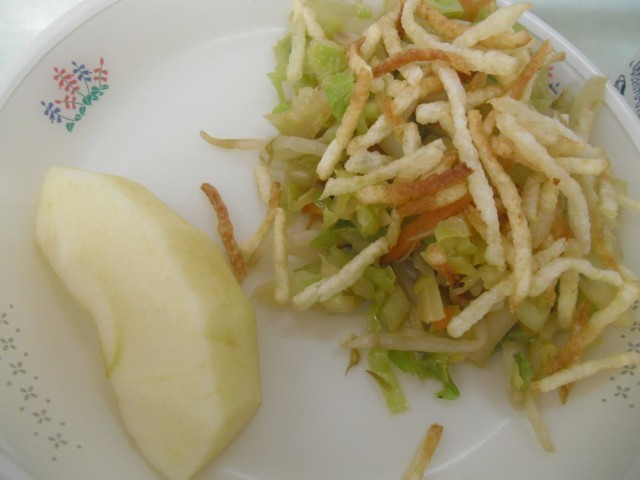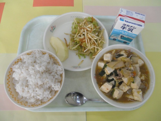 麦入りごはん キムチ豆腐 ポテト入りナムル りんご