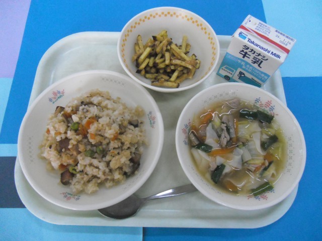 五目チャーハン さつまいもの塩けんぴ風 ワンタンスープ