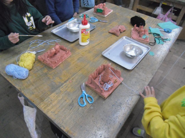 大好きなものをテラコッタ粘土で作りました。今日は毛糸やお花紙でカラフルに仕上げていきました。