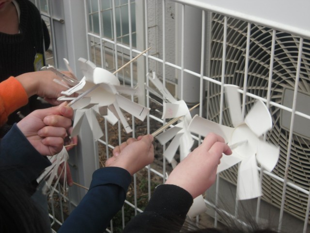 「子どもは風の子」。寒い季節でも「風車」です。友達と競い合うように走りまわったり、一人でダッシュしたりとクルクル回る風車は楽しいです。でも風がなくてもいつでも強風の場所を見つけてしまったようです・・・