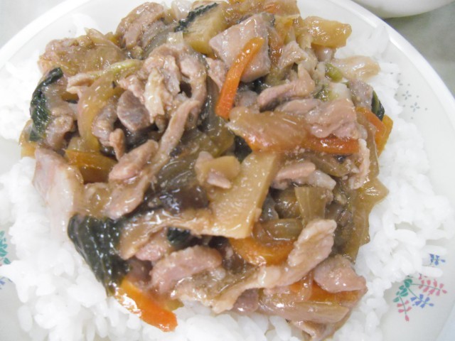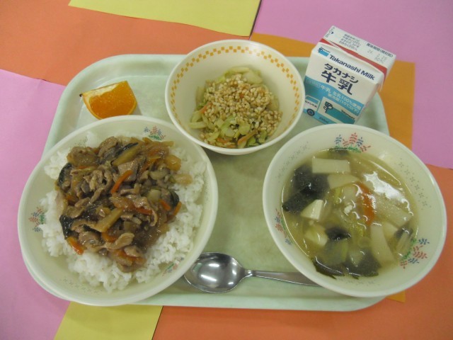 豚丼 サクサク玄米サラダ 豆腐とわかめのスープ オレンジ