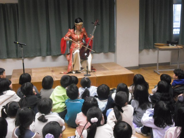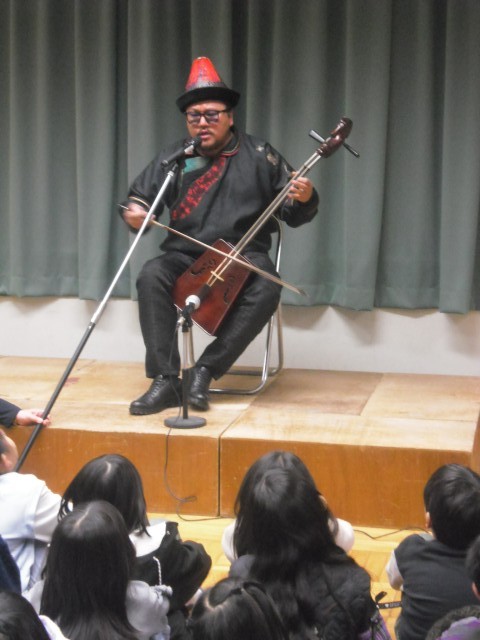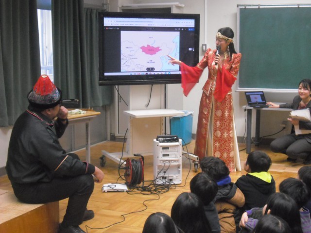 国語「スーホの白い馬」の舞台となっている国、モンゴルからお客様をお迎えしての時間となりました。はじめに画像を使ってモンゴルの自然や歴史について教わりました。次は物語にも登場した楽器「馬頭琴」の演奏を聴かせていただきました。さらにモンゴル語では「喉声」を意味する「ホーミー」の伝統的で神秘的な歌唱を聞くこともできました。子供たちも驚きながらも、じっくりと聞き入っていました。物語の理解だけでなく、国際交流の良い機会となりました。「バヤルララー」(ありがとうございました!)