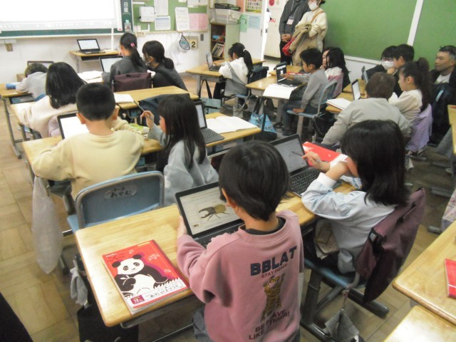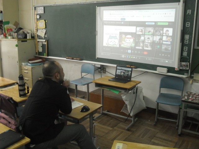 タブレットを使って上手に作ったクイズを出す時間でした。ヒントを考えて、答えを当てていきます。1組は学級閉鎖中でしたが、参加できる児童は任意でオンライン形式で参加していました。