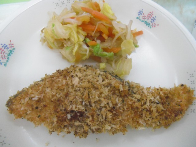 ごま塩ごはん 魚のパン粉焼き 野菜のからし和え きのこ汁