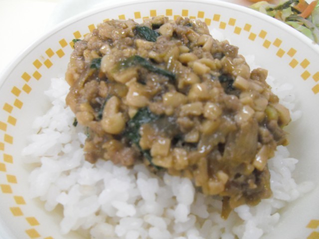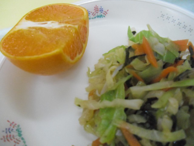 スタミナ納豆 ごはん 野菜の磯香あえ じゃがいものみそ汁 オレンジ
