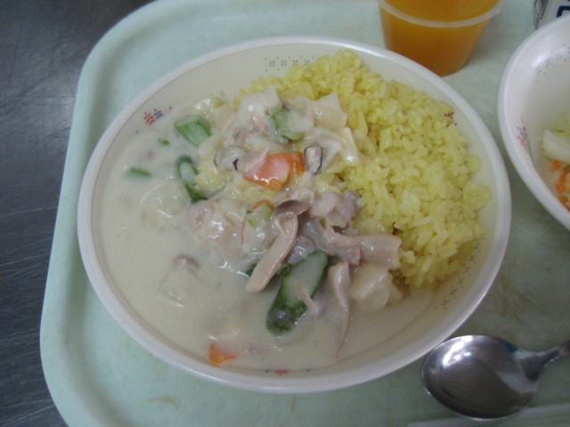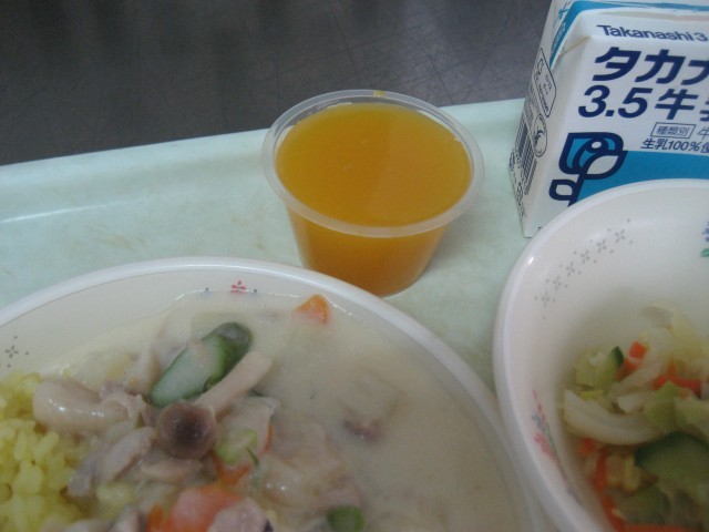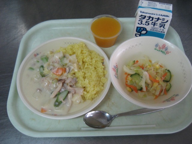 ターメリックライス春野菜のクリームソースかけ コールスローサラダ オレンジゼリー