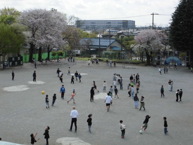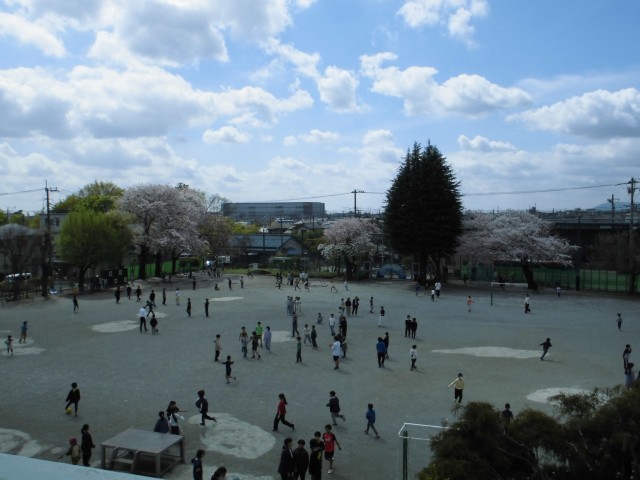 中休みには、新しいクラスの友達や先生と校庭で元気に遊んでいました。