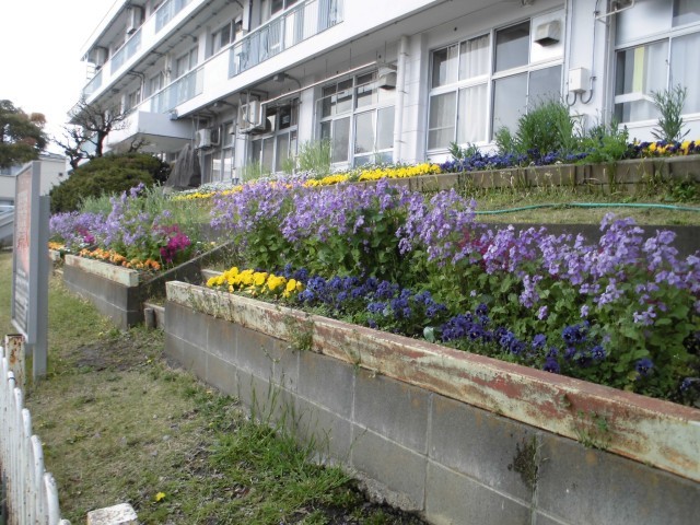 桜をはじめ春の花々がきれいです。昨年度の委員会の5・6年生ががんばってくれました。