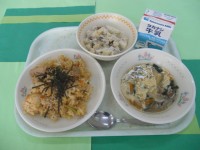 今日の献立は、山菜ごはん、さわらのごまみそ焼き、菜の花あえ、けんちん汁、牛乳です。