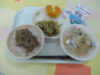 がめ煮 わかめごはん 味噌ドレッシサラダ オレンジ