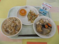 こぎつねごはん おでん 野菜のじゃこあえ みかん