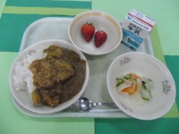 カツカレーライス 野菜の甘酢和え いちご