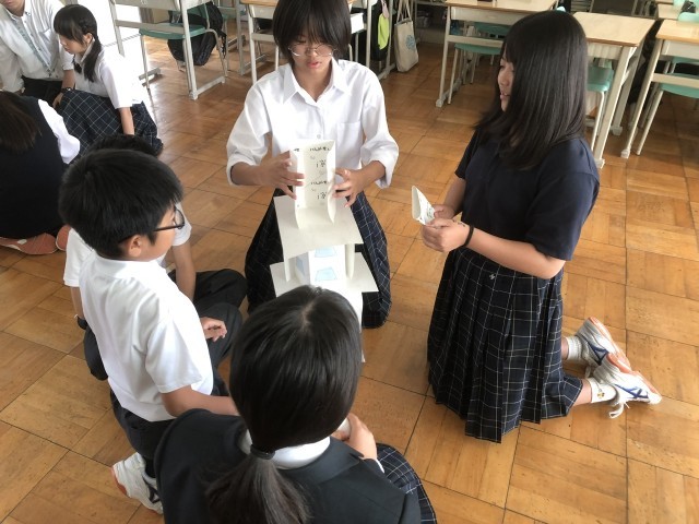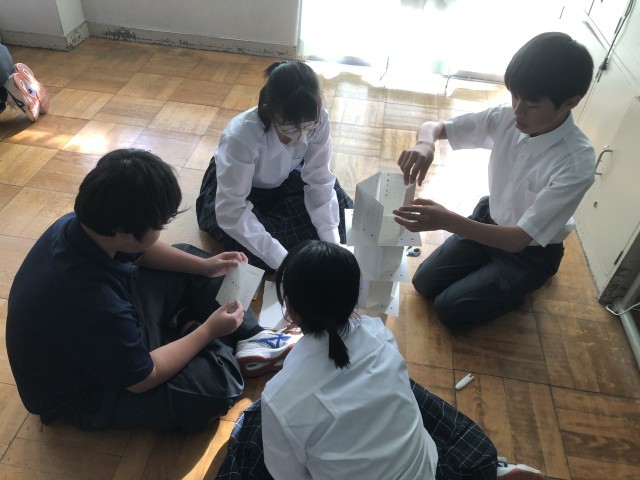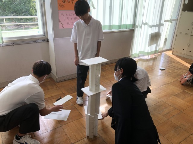 7年生の道徳では、よりよい集団生活の向上を目指して、A4の紙三十枚を使用してペーパータワーを作る活動を行いました。意見を出し合いながら試行錯誤する過程で協力することについて学びました。