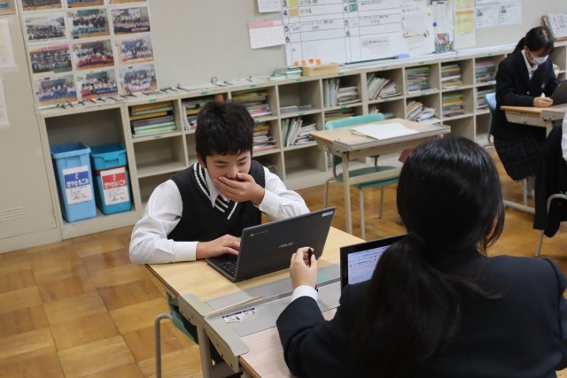 職場体験の事後発表に向けて、スライド作成を行いました。体験で学んだことを、相談しながらまとめている様子を見ることができました。