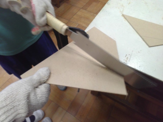のこぎりで板を切って、組み合わせを工夫し、使って楽しいものをつくっています。