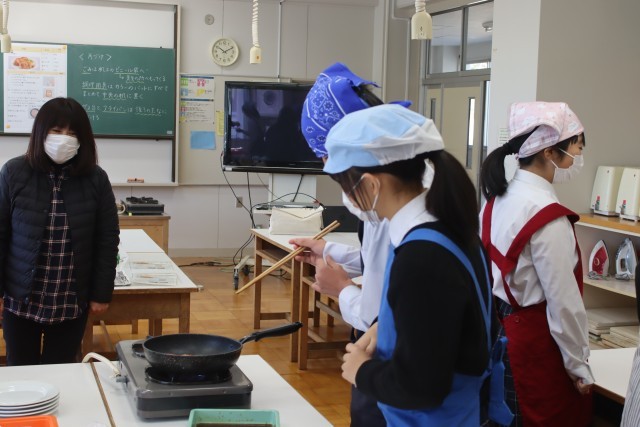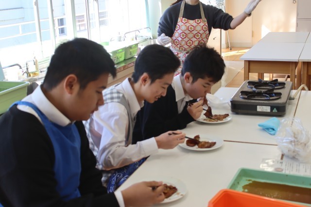 家庭科の授業にて、調理実習を行いました。今回は、「生姜焼き」を作りました。どの班も美味しく調理することができ、大満足な表情を見ることができました。