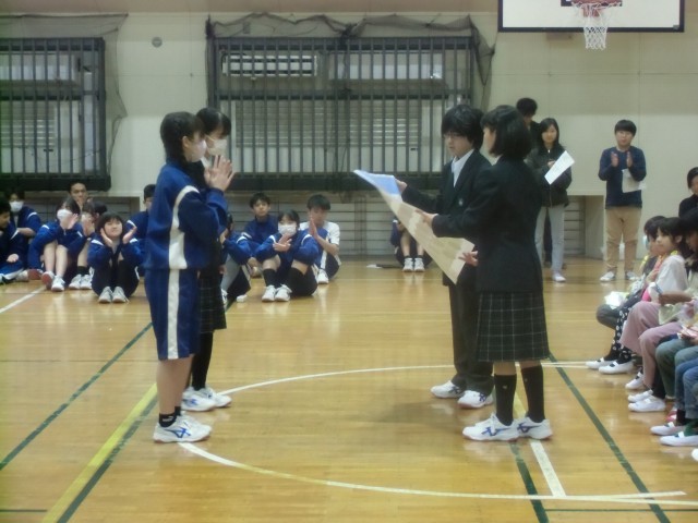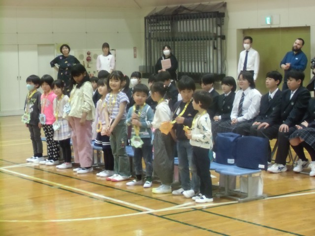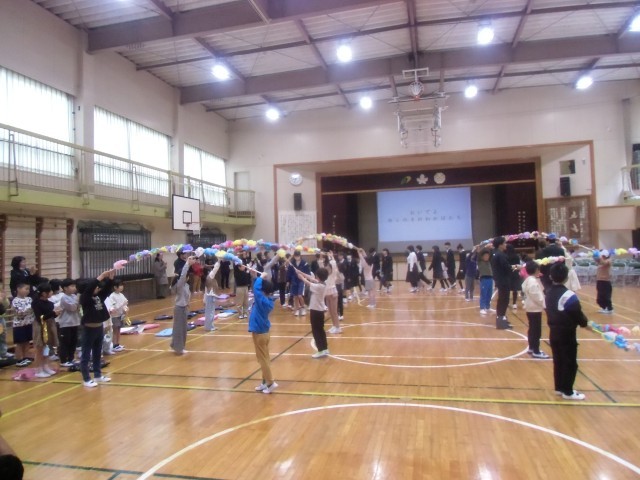 花のアーチの中を1年生と7年生が手をつないで入場。ゆくのき学園に関するクイズや、1年生・7年生へのプレゼントなど、温かく新入生を迎える時間になりました。