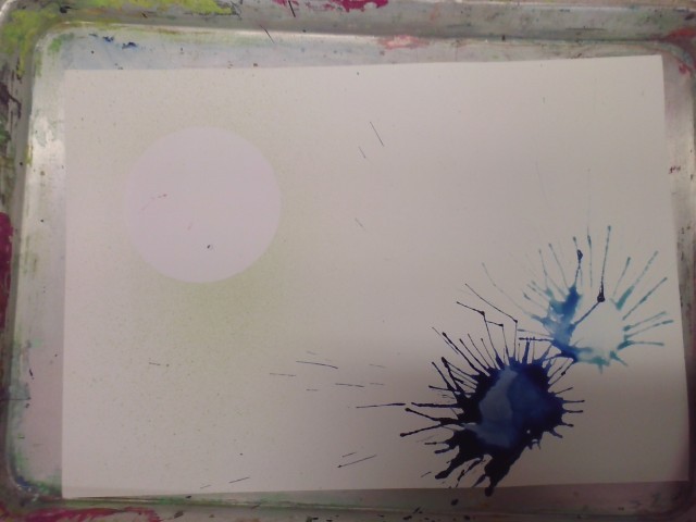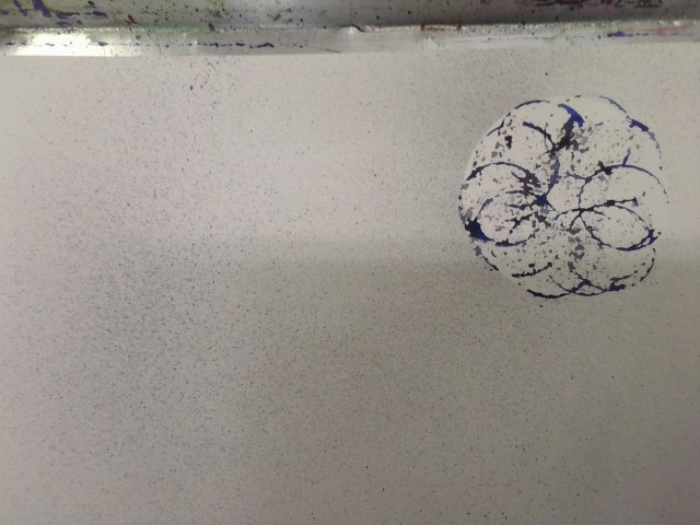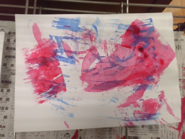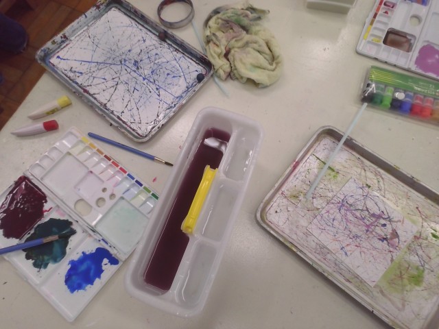 ビー玉やたわし、へらや網など身の回りのものを使って、絵の具でいろいろと表現しました。