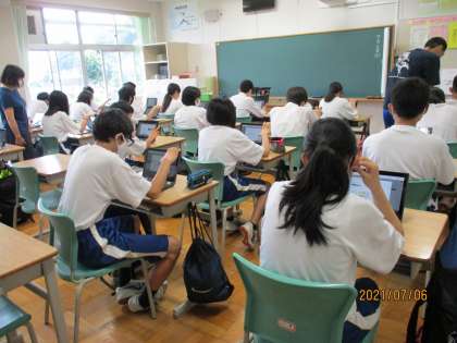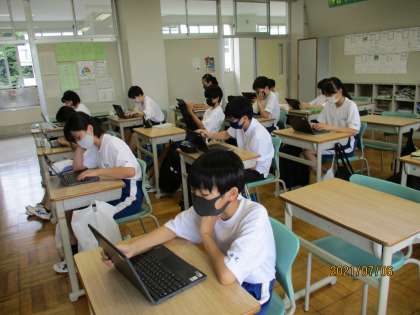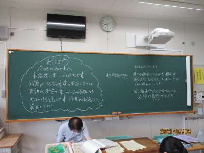 今朝も中学生は朝ナビマに取り組みました。最初に入った7年生教室は、中に人がいるのかと感じるほど静まり返り、各自が自分に合ったスピードで黙々と集中して課題に取り組んでいました。使い始めの頃に比べ、入力、回答時間の速さが格段に向上し、まさに進化中。黒板には担任からの熱いメッセージも記されていました。8年生はナビマの前に、クロームブックを使った課題提出方法について練習していました。